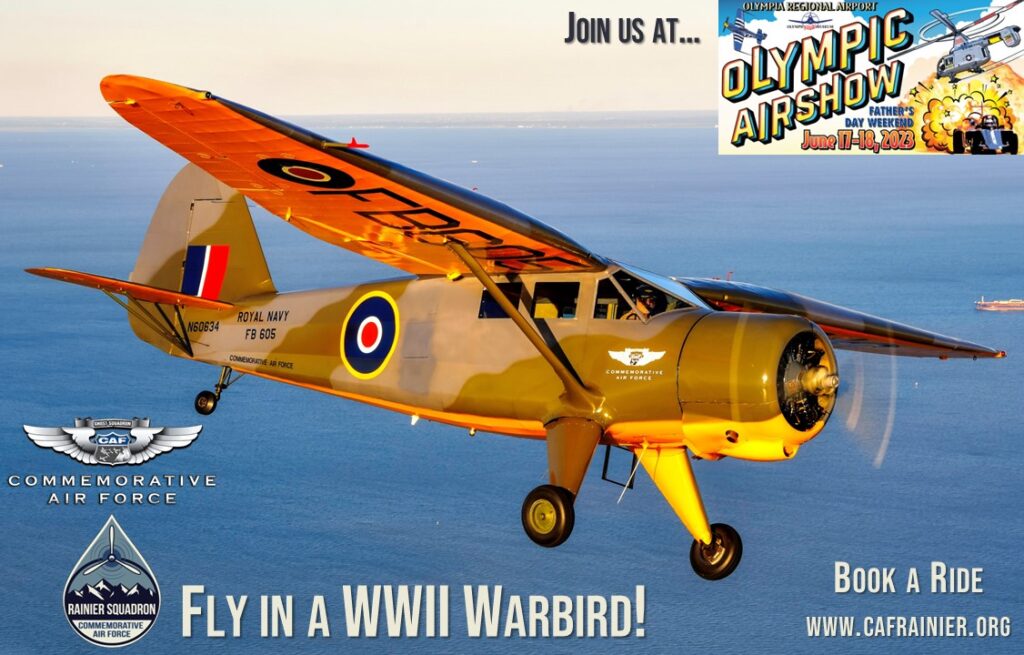 Join us at the annual Olympic Airshow June 17 and 18. Our 1944 Stinson AT-19 / Reliant will be on display and available for rides! Get your once in a lifetime ride in a real WWII veteran – our aircraft served with the UK Royal Navy in India.